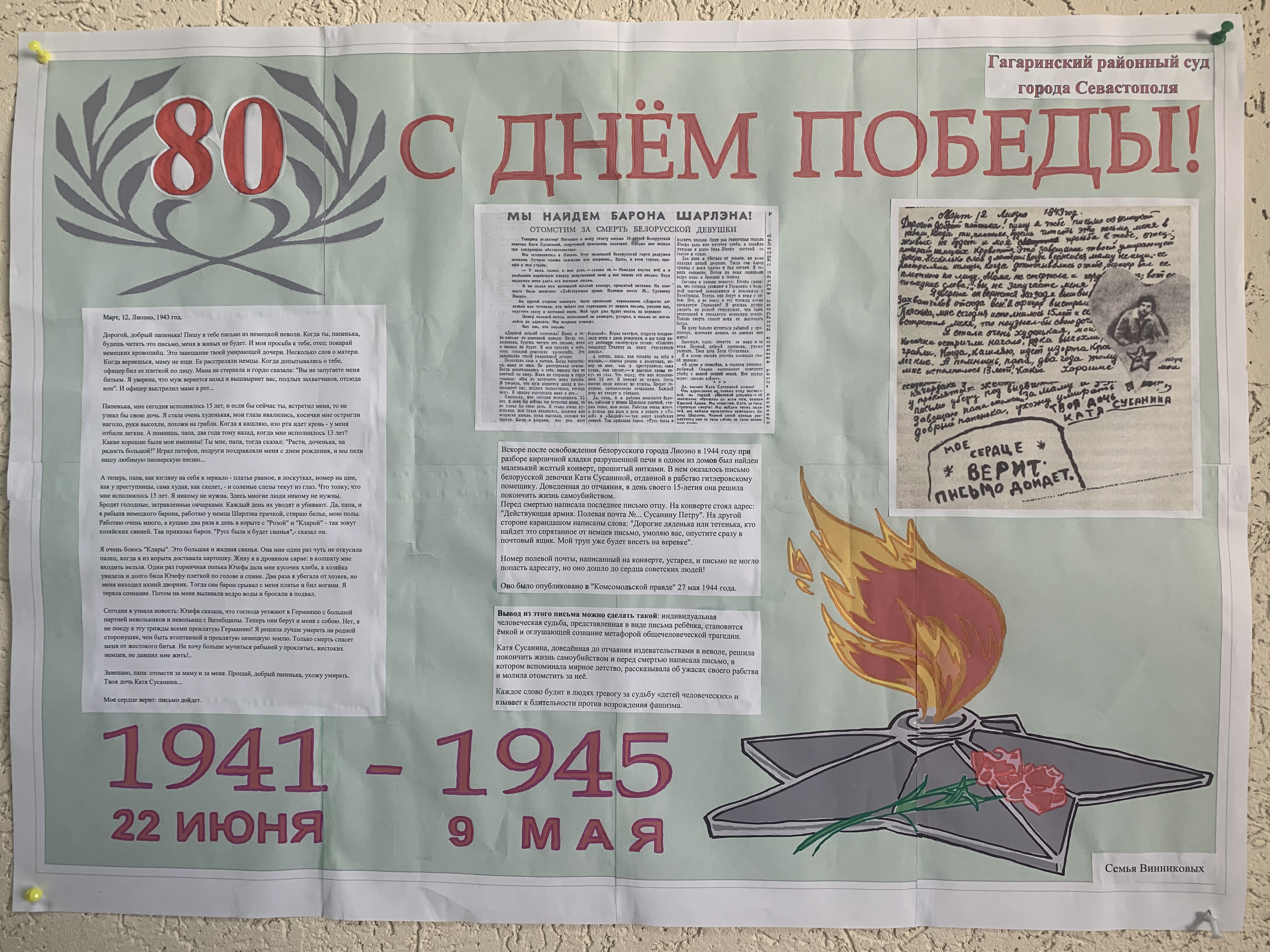 В Гагаринском районном суде в честь 80-й годовщины Победы в Великой Отечественной войне был организован специальный уголок, посвящённый этому значимому событию. Дети судей и работников аппарата суда создали уникальные поделки, рисунки и открытки, которые отражают их восприятие героизма и мужества, проявленных в годы войны.