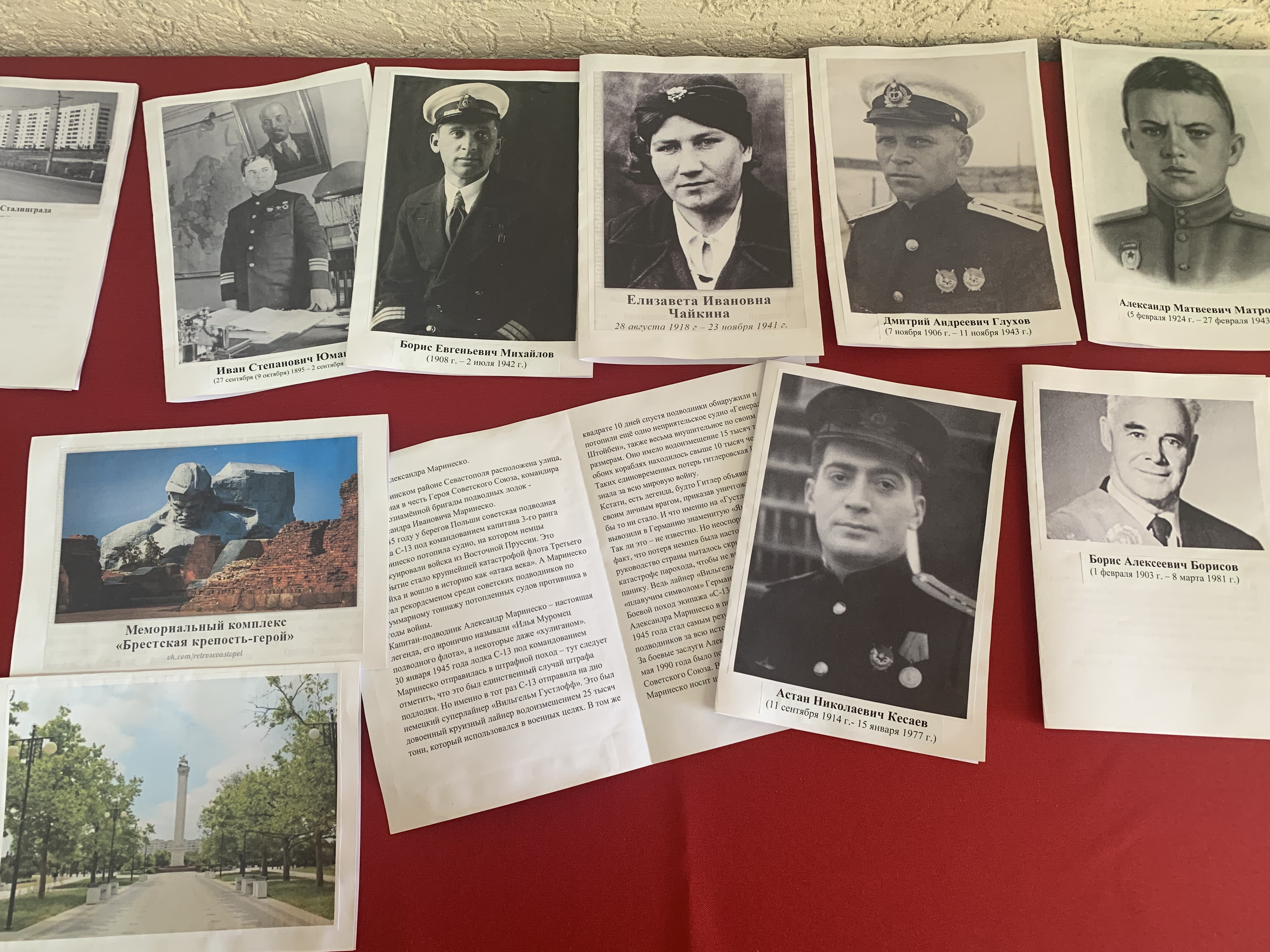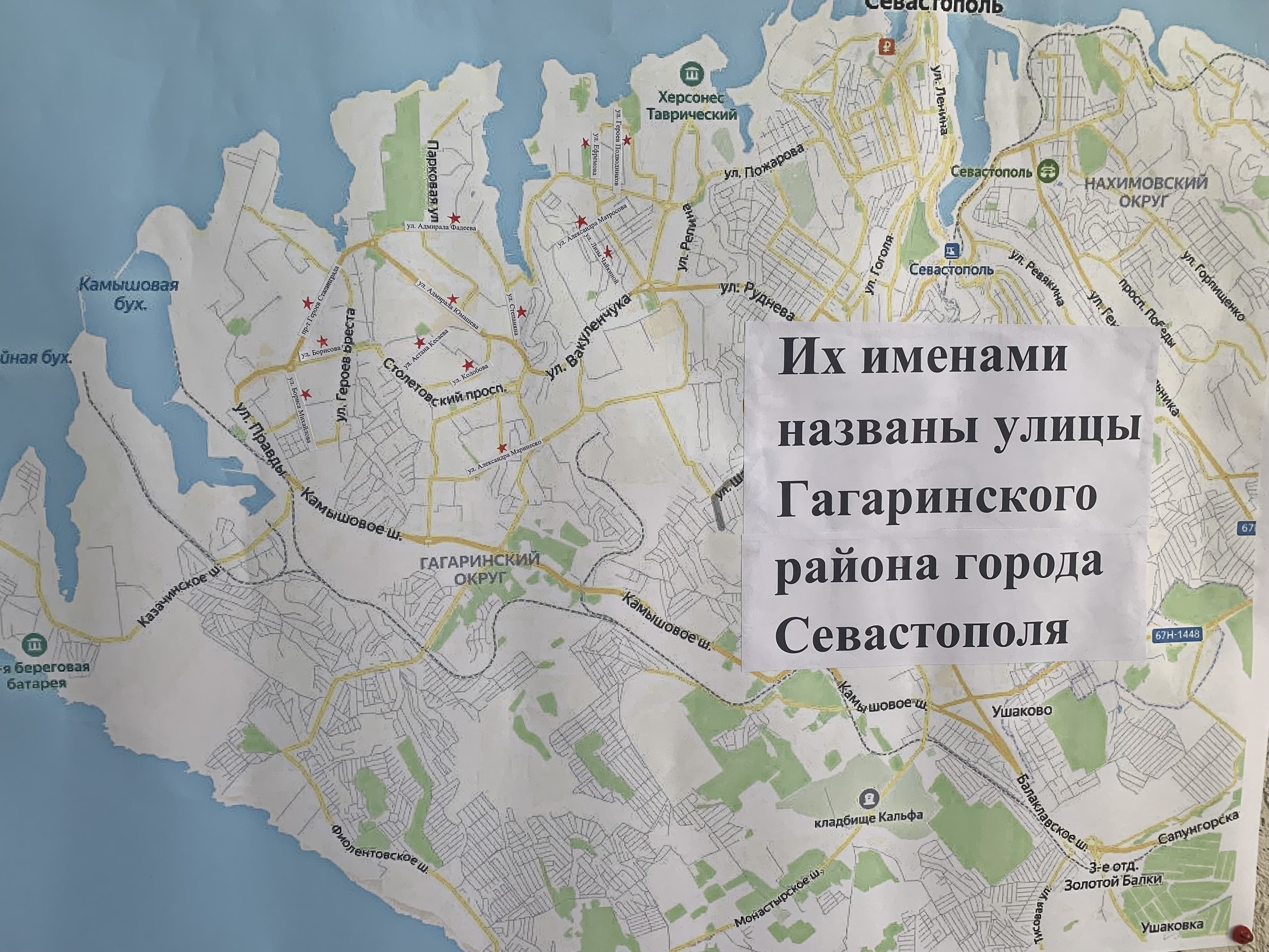 Отдельное место в экспозиции занимает карта Гагаринского района Севастополя, на которой отмечены улицы, названные в честь героев Великой Отечественной войны. Сотрудники суда подготовили буклеты с историческими справками о таких героях.